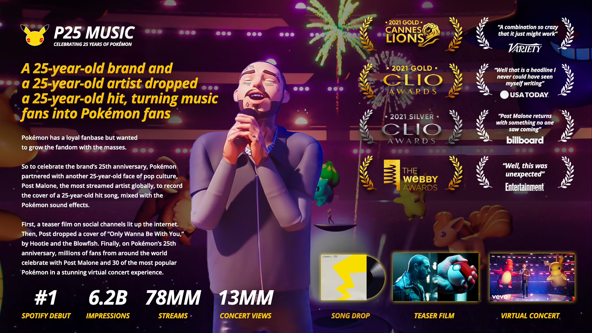 Lindsey is proud to have led an incredibly talented Client and multi-agency team in the strategic development and execution of P25 Music: a year-long music platform and celebrating 25 years of the World’s famous games and characters. The campaign teamed up Pokémon with Universal Music Group, creating all-new music, videos, a full album and merch collaborations as well as a never-been-done-before motion-captured and animated virtual concert event. The celebration was picked up by major media outlets worldwide, placed Pokémon on the Billboard charts and was awarded a Gold Cannes Lion, Four Clio Awards, a Webby and a OneShow Award.